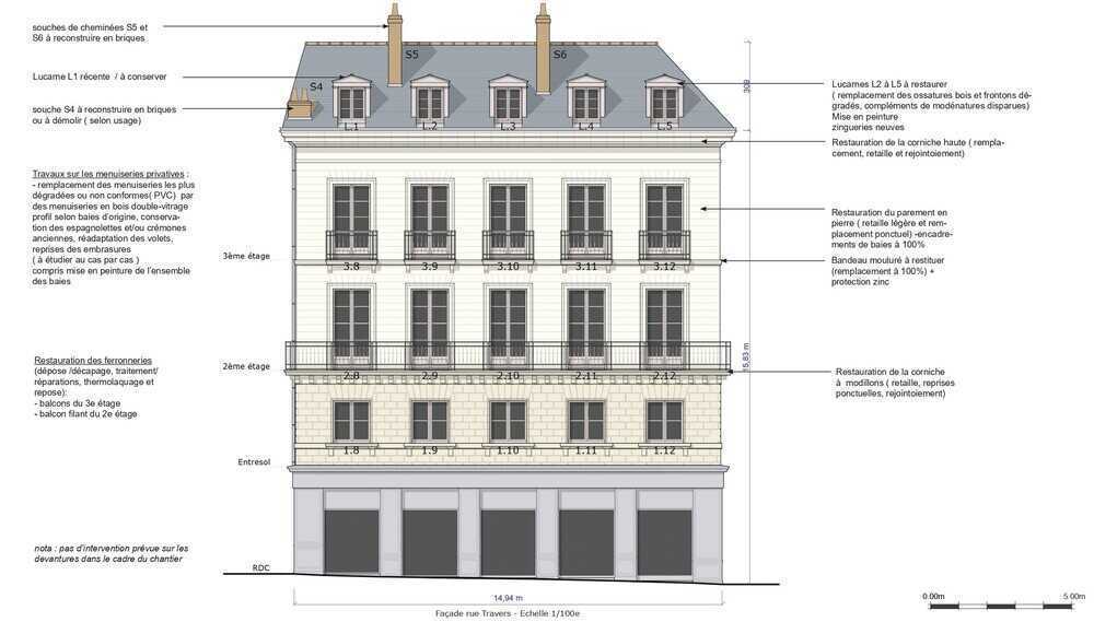 La copropriété a choisi le cabinet d’architecture Antak pour l’étude et la réalisation de ces travaux de restauration. De nombreuses entreprises participent à ce chantier de restauration : Sorenov pour la taille de pierre, Sorma pour la maçonnerie, Forge Déco Ouest pour la ferronnerie, Gente Poilane pour les menuiseries extérieures, Pachet pour la couverture et la zinguerie, Cruard pour la charpente ou encore Yannick Minault pour la peinture.