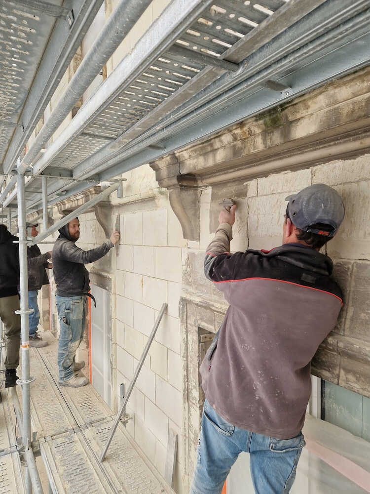 À noter le travail également remarquable des tailleurs de pierre dans le respect des natures de pierre et encore des moulurations d’origine. Les façades, parement mais aussi corniches, présentaient en effet des dommages importants : pierres abîmées voire manquantes ou encore très encrassées.