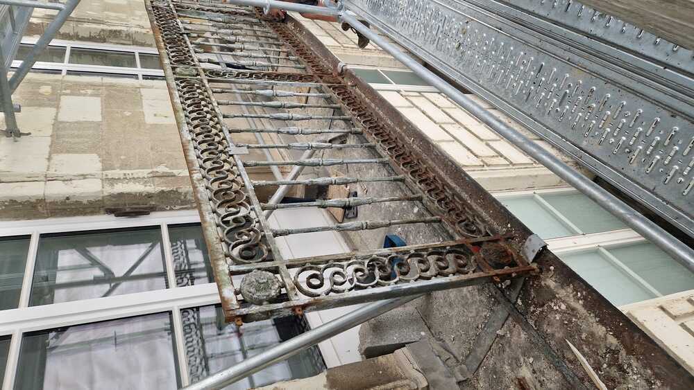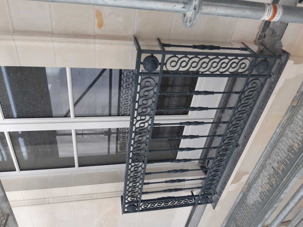 Autre élément des façades : les ferronneries de cet édifice sont particulièrement ouvragées. Ils présentent des motifs en fonte à lancettes encadrées d’entrelacs. Leur restauration a impliqué leur dépose complète puis repose selon des techniques traditionnelles.