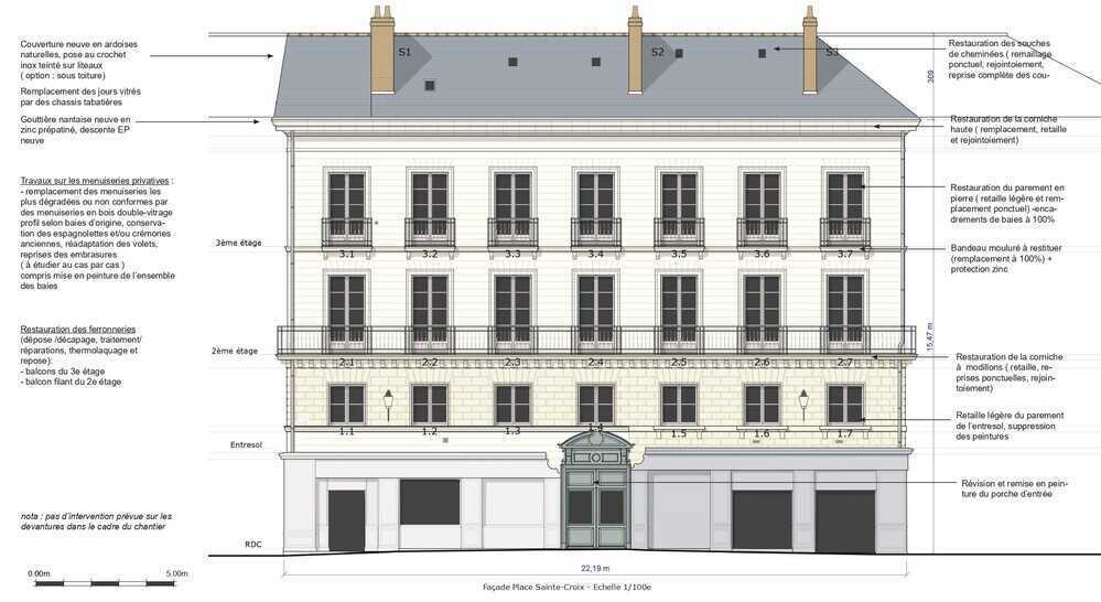 Ces travaux importants ont intégré notamment : la réfection des couvertures, des souches de cheminées donnant sur la place Sainte Croix, l’intégralité des parements en pierre de taille, des ferronneries, des zingueries vétustes ainsi que l’harmonisation des menuiseries, des peintures et boiseries et la rationalisation des réseaux rapportés en façades...