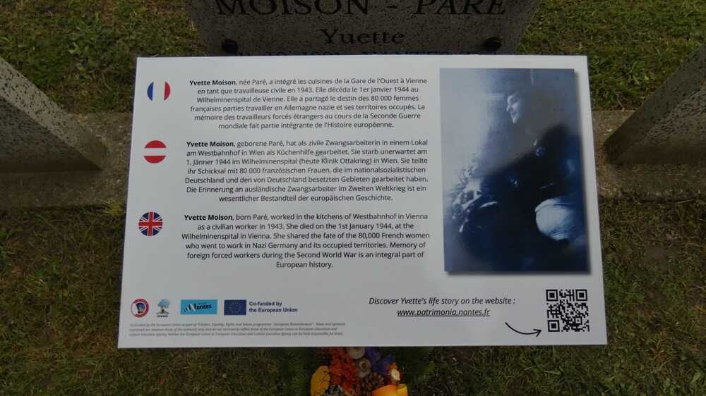 Ce 8 mai 2025, au cours de la cérémonie au carré des Français du cimetière central de Vienne, Annick Soret, la fille d’Yvette, a dévoilé une plaque commémorative en mémoire à sa mère et aux travailleuses civiles, qui renvoie vers Nantes Patrimonia.