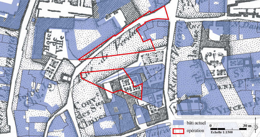 Les aménagements successifs, les percements de rue et les bombardements ont fini par gommer totalement les vestiges de ce secteur prééminent du centre de Nantes. Si les chronologies rencontrées sont extrêmement récentes, elles témoignent néanmoins de la mise en place d'un îlot d'habitations au cours du 19e siècle, en plein cœur de Nantes. Des murs, quelques canalisations et des sols de cette époque ont été mis au jour lors de la fouille, accompagnés de fragments de céramiques