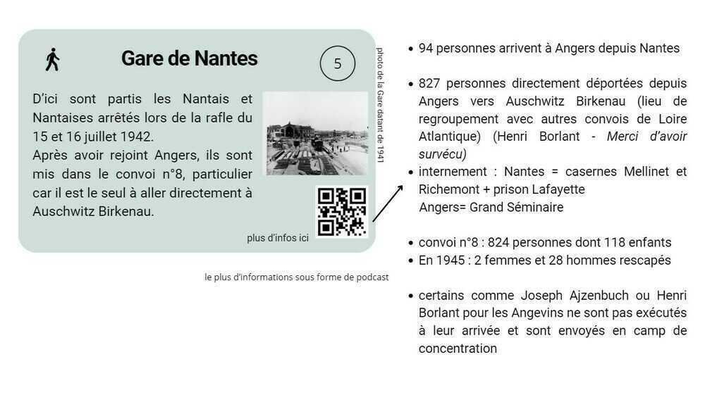 Pour le moment, le choix a été fait de se consacrer à la première rafle, celle des 15-16-17 juillet 1942. Tous les élèves ont choisi de faire débuter leur parcours à la synagogue de Nantes et de le faire s’arrêter à la gare d’où les personnes arrêtées ont été déportées vers Angers puis Auschwitz-Birkenau.