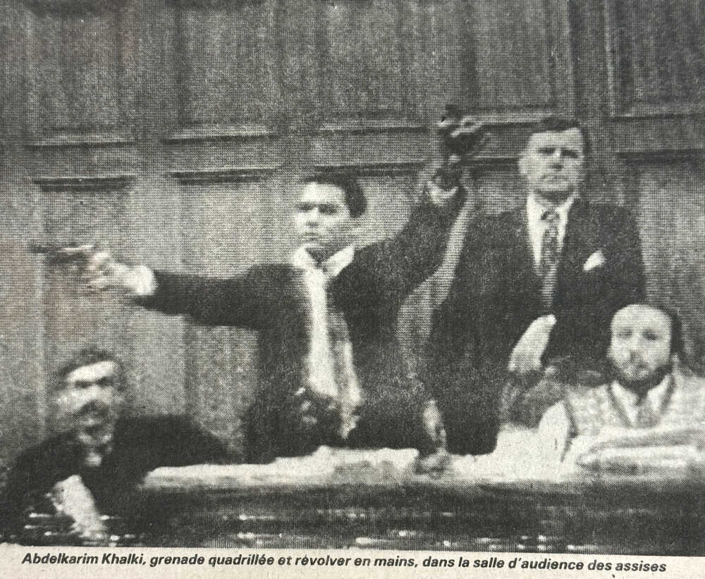 Le 19 décembre 1985, Abdelkarim Khalki fait irruption dans la salle d’audience de la cour d’assises de Loire-Atlantique, armé d’un revolver et d’une grenade, alors que se termine le procès de Georges Courtois et Patrick Thiolet pour braquage. En quelques instants, les trois complices prennent le contrôle de l’assemblée et s’engagent dans une prise d’otages qui durera 34 heures.