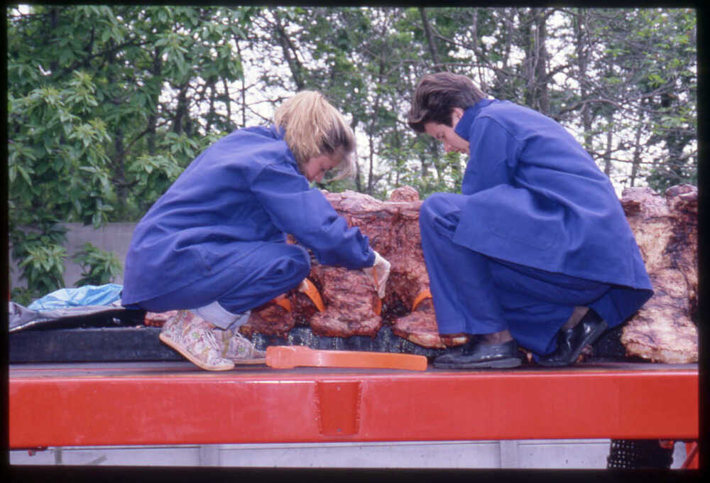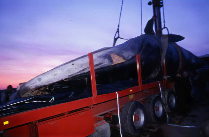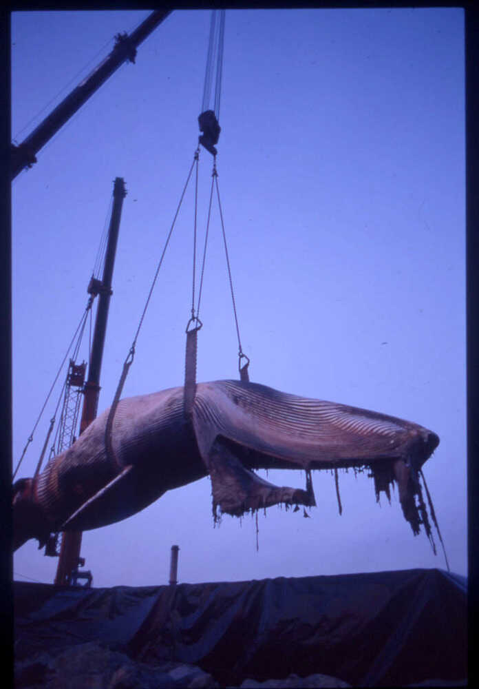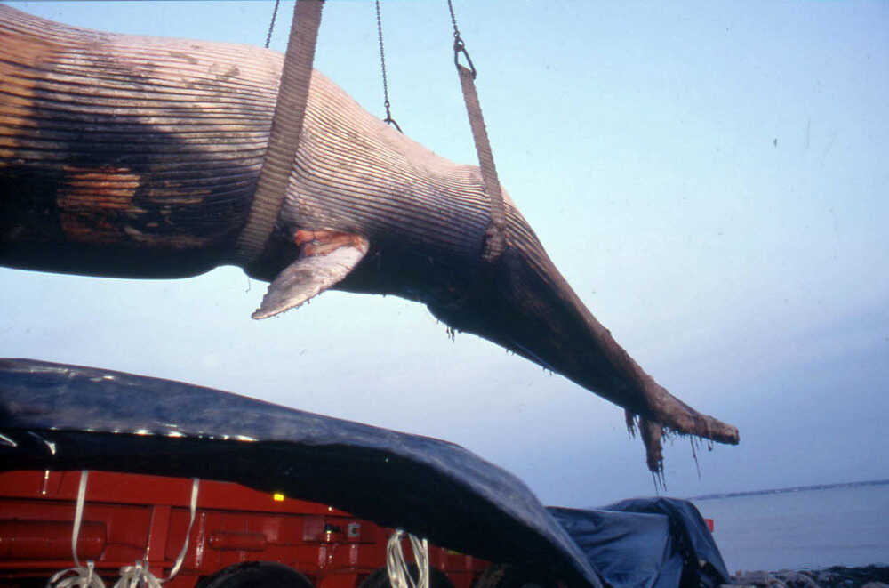 Dans les jours qui suivent, les équipes du Muséum et de l’École se rendent à Donges pour examiner le rorqual. La première étape est de le sortir de l’eau en tirant l’animal avec un câble, mais sa queue se casse. On envisage alors son levage avec deux grues de 100 tonnes, pour le déposer ensuite sur une plateforme technique et l’amener à Nantes. Les photographies du levage témoignent des difficultés rencontrées pour un spécimen de cette taille. Le transport est assuré de nuit, par un camion semi-remorque, après l’aval de la direction des services vétérinaires obtenu par le professeur Costiou.