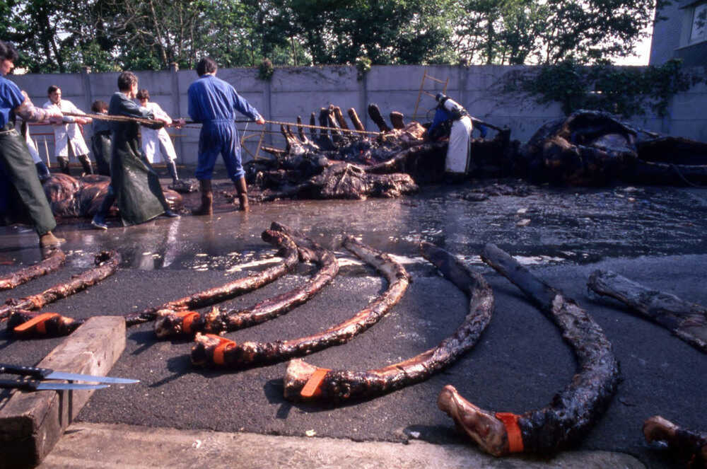 Le squelette est ensuite traité pour en enlever un maximum de restes de tissus mous. Pendant environ un an et demi, les os sont trempés dans des solutions spécifiques pour les dégraisser, puis nettoyés à l’eau pour garantir la bonne conservation du squelette et permettre l’accrochage et l’exposition muséographique. Auparavant les baleines étaient dégraissées en restant une dizaine d’années dans le sable sur les plages de nos côtes.