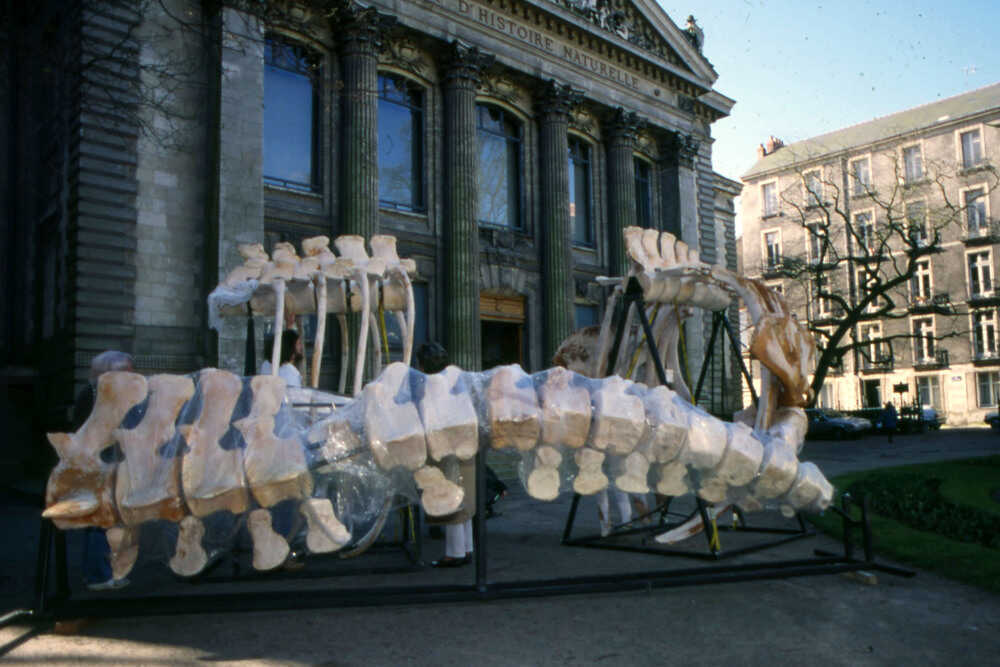 De 1991 à 1995, le Muséum d’histoire naturelle de Nantes et l’Unité d’Anatomie de l’École vétérinaire travaillent ensemble afin de sauver et de documenter le squelette d’une baleine, ou Rorqual commun, de plus de 18 mètres de long, échouée près du port de Donges. Véritable aventure humaine qui a permis de retracer l’histoire de cet animal, ce long travail s’achève le 1er avril 1995, lors de l’inauguration du plus grand squelette présenté au public au Muséum de Nantes.