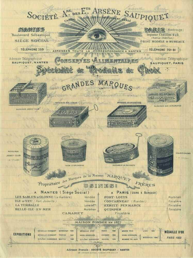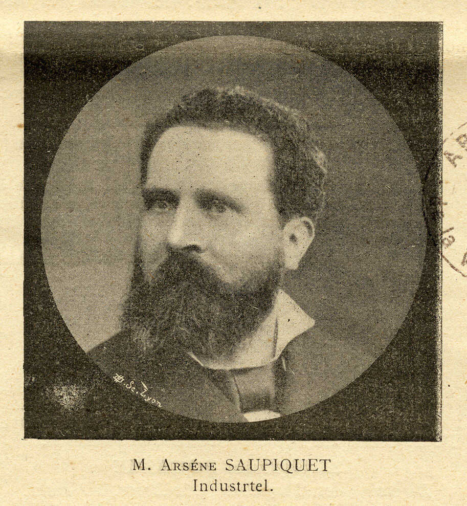 Pierre Géraud Arsène Saupiquet est né à Jussac en 1849. D’une famille de marchands et de ferblantiers-chaudronniers cantalous, il est recensé voyageur de commerce en 1869 et s’établit avant 1872 à Nantes. Il aurait travaillé chez Riom (imprimeur ferblantier) avant de s’associer à Jacquier (conserveur). Cette association est de courte durée (1875-1877) mais lui fait découvrir le métier.