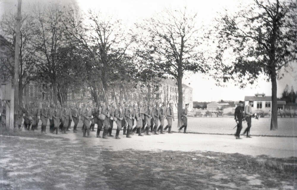 Troupes russes en uniforme de fantassin de campagne défilant sur l’actuelle place du Maréchal Foch, le 26 août 1916