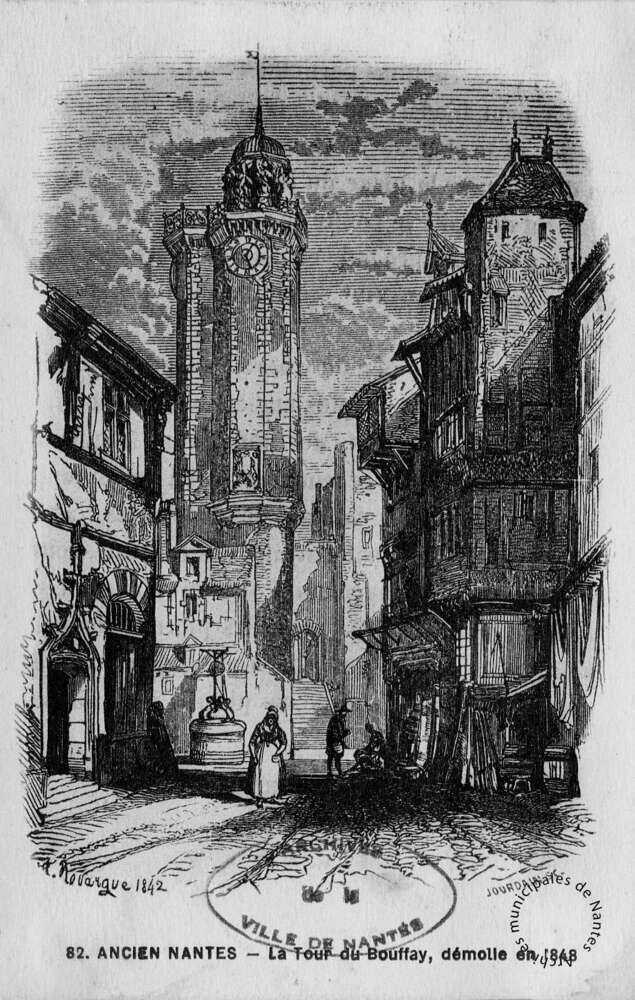 Dans les années 1660, la tour circulaire de la forteresse du Bouffay bénéficie d’une extension octogonale au sommet de laquelle est placée une horloge et une cloche. Au sommet de ce beffroi, huit cariatides supportent un dôme en bois couvert de plomb.
