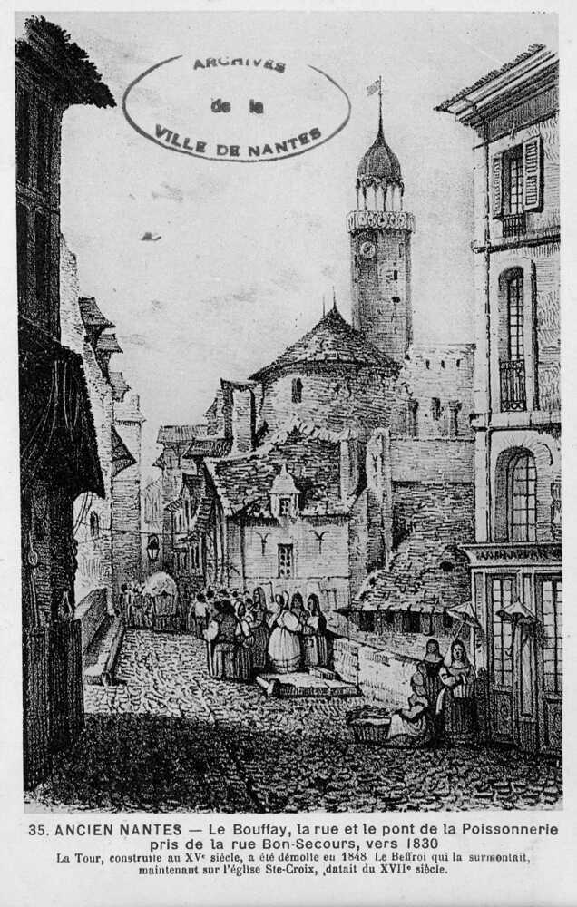 Le projet de halles commerciales et de sa tour est finalement abandonné. Le beffroi du Bouffay est réinstallé au sommet de l’église Sainte-Croix en 1860.