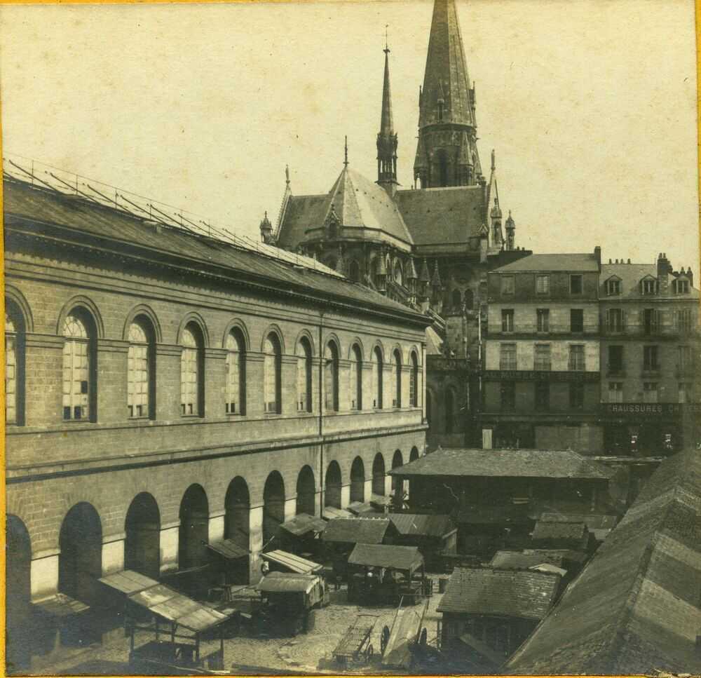 Occupé ailleurs, Ogée confie le projet à Mathurin Peccot, architecte-voyer honoraire de la ville, qui imagine un plan en forme de fer à cheval. Mais, dans le même temps, Mathurin Crucy propose d’édifier un marché couvert pour les fruits et légumes et, au-dessus, une halle aux toiles où l’on vendra hebdomadairement des lins, fils et tissus divers. C’est ce programme qui remporte l’adhésion, et après plusieurs modifications des plans à la suite des interventions du Conseil des Bâtiments civils, les travaux de l’édifice sont engagés en 1824, mais l’ouvrage n’est livré qu’en 1826 suite à des aléas de chantier.