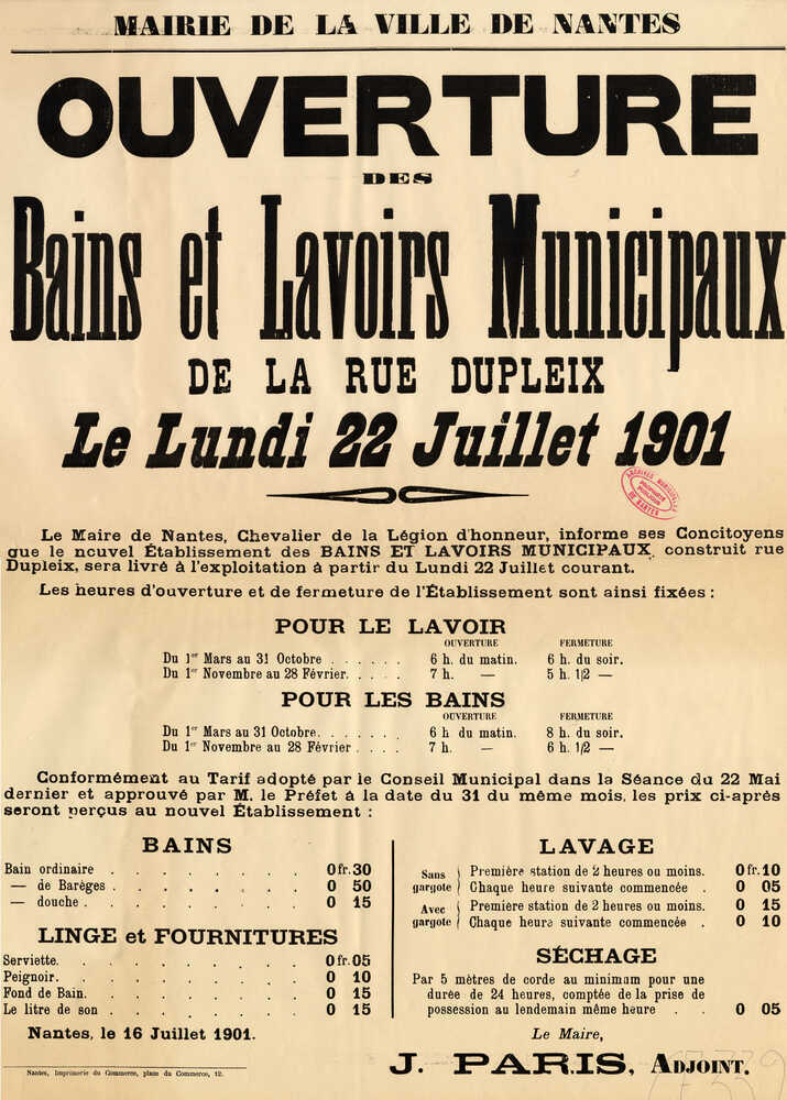 C’est dans cette ambiance hygiéniste qu’en 1850, l’Assemblée nationale vote une mesure qui donne la responsabilité de l’expertise de l’insalubrité des logements aux conseils municipaux ainsi que des crédits pour construire des bains-douches publics. Suite à des rapports sur l’insalubrité de certains quartiers nantais et notamment sur celui de la butte Sainte-Anne, le conseil municipal décide en 1897 d’ouvrir de façon radicale l’enchevêtrement de ruelles et de cours à l’est de l’avenue Saint-Anne en créant la rue Dupleix. À l’angle de la ruelle des Grands Jardins (aujourd’hui détruite), un terrain est affecté à la construction de « bains et lavoirs municipaux ». Ils sont dessinés par Alfred Marchand, architecte communal, et sont inaugurés en 1901.