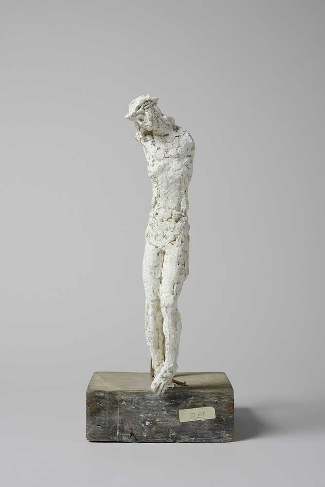 Après avoir commandé et reçu les pièces de bois, il s’attelle au travail au sein de son atelier parisien du 15e arrondissement de Paris, entre 1953 et 1956. Pour cela, il réalise tout d’abord de petites esquisses en argile d’une vingtaine de centimètres. Elles lui permettent de traduire une intention : le dessin initial d’un grand Christ en croix, entouré de la Vierge et de saint Jean. Les figurines d’argile déterminent le placement des personnages, la position des mains, l’inclinaison d’une tête… Il s’agit pour l’artiste de sentir comment va s’articuler le calvaire, comment vont communiquer les trois éléments ensemble, et comment ils se détacheront de la mosaïque du chœur conçue par Gabriel Loire. Les deux artistes vont correspondre afin de coordonner leurs travaux. La tâche est aisée car ils se connaissent bien : ils ont déjà réalisé ensemble, entre 1934 et 1935, le décor d’une chapelle funéraire privée au Gault-Saint-Denis en Eure-et-Loir, et un monument dédié à la Vierge à Saint-Amand-sur-Sèvre en 1938.