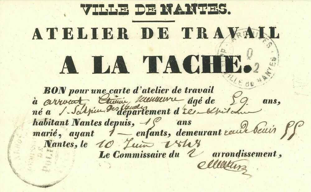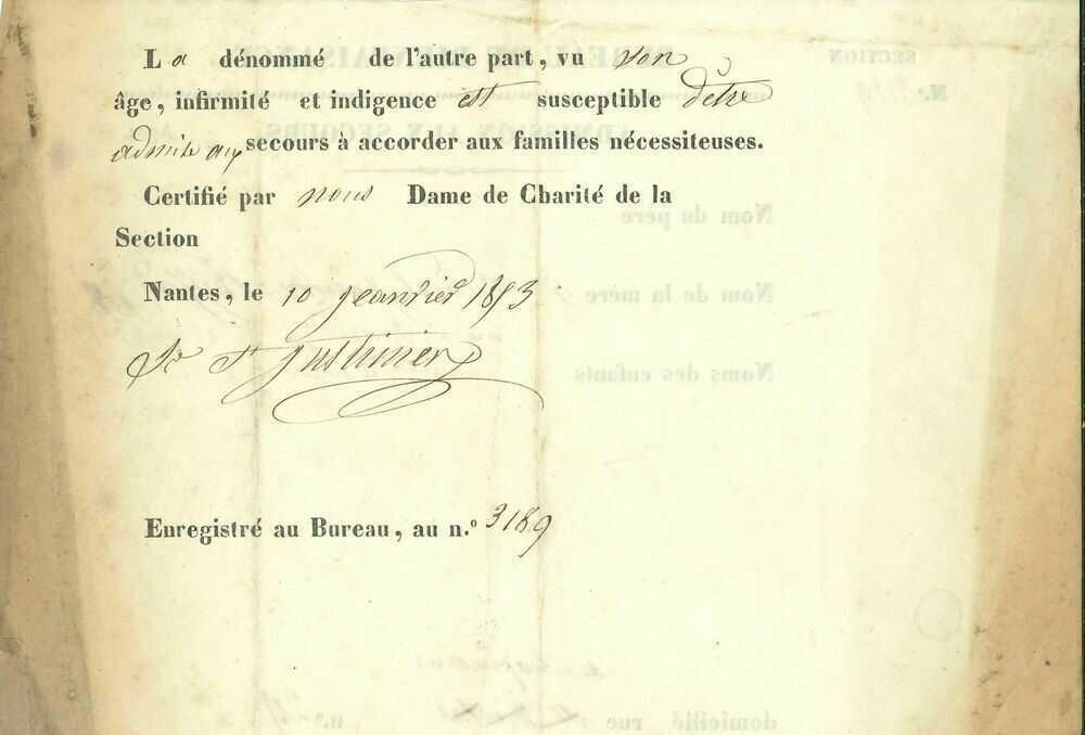 À Nantes, cet organisme est mis en œuvre dès 1796 par la municipalité. Cinq commissaires sont missionnés pour distribuer des rations de pain aux indigents et aux malades, ainsi que de la tourbe pour le chauffage pendant l’hiver. Ces mesures s’avérant insuffisantes, le maire de Nantes donne davantage de moyens humains au bureau de bienfaisance au début du 19e siècle. Une commission administrative de six membres, présidée par le maire, est nommée pour délibérer sur toutes les questions qui se rattachent à l’administration du bureau et à la distribution des aides. Il est prévu qu’une soixantaine de religieuses appartenant aux Dames de Charité l’assiste afin d’agir auprès des nécessiteux sur le terrain.