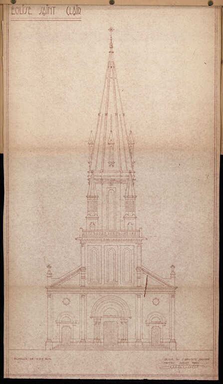 Le plan de l’édifice est l’œuvre de l’architecte Gustave Bourgerel. Ce dernier, ne cédant pas à l’engouement néo-gothique qui caractérise les églises construites au milieu du 19e siècle, se réfère à l’architecture paléochrétienne pour concevoir l’église. Le 4 avril 1858, le monument est béni par l’évêque de Nantes. Le 25 juillet suivant, un décret impérial promulgue la création de la paroisse et dans une ordonnance du 16 août, monseigneur Jacquemet érige le nouveau lieu de culte en église paroissiale sous l’invocation de saint Clair. Une quinzaine de jours plus tard, la fabrique acquiert le presbytère installé sur un terrain appartenant à madame de la Bassetière. En 1883, le jardin attenant est amputé par la percée du boulevard Pasteur conférant au presbytère une impression de suspension au-dessus de la nouvelle voie.