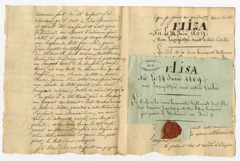 Fille d’Adélaïde Aumand, brodeuse d’une trentaine d’années, Élisa Mercoeur est abandonnée trois jours après sa naissance devant la porte de l’Hospice des Orphelins de Nantes. Elle porte le nom de « Mercoeur » qui lui est donné par un commissaire de police chargé de constater l’abandon des enfants, et qui renvoie à un personnage de l’histoire locale, peu connu du grand public, le duc de Mercoeur, un ancien gouverneur de Bretagne. Son père est longtemps demeuré inconnu, et est peut-être François-Jude Barré, un homme de loi nantais.