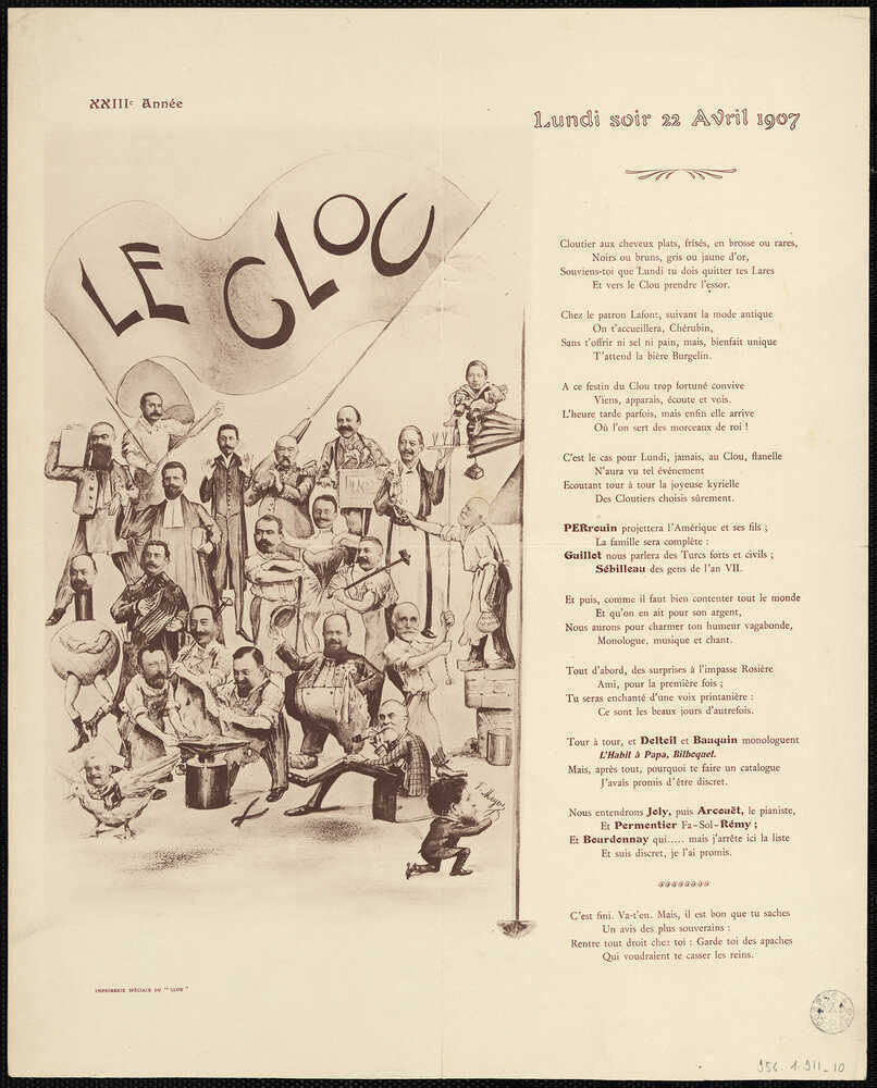 Ces messieurs se retrouvent dans l’atelier d’architecte de Lafont, impasse Rosière, tous les quinze jours pendant la saison théâtrale. Ils proposent aux membres de la société et à leurs invités – y compris des femmes, notamment pour un « Clou des dames » annuel – des séances organisées sur le modèle du spectacle varié, alors en vogue notamment dans les associations. Conférences savantes ou humoristiques, littérature, poésie, musique de chambre, monologues comiques, chansonnettes à la mode, pièces de théâtre, ombres chinoises, revues, tous ces genres se mêlent dans la recherche de la nouveauté et l’alternance des registres, même si le rire l’emporte.