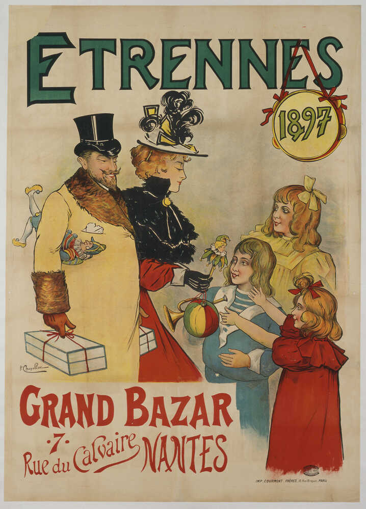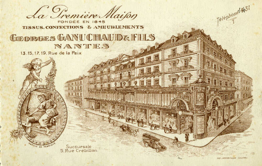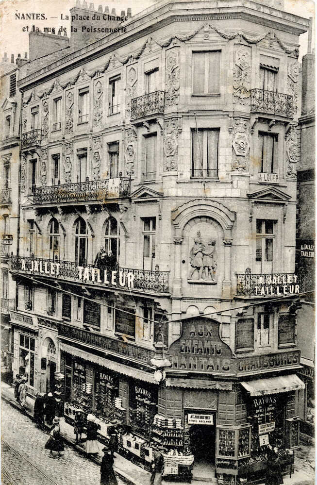 L’un d’eux, Fraisse et Patasson, installé au n°1 de la place Royale, est caractéristique de ces nouvelles grandes boutiques. Mentionné pour la première fois en 1848, Fraisse et Patasson est dirigé par Léon-Honoré Patasson négociant et Paul Fraisse lui-même fils de négociant. À deux, ils ont formé une société pour l’exploitation de la « maison de commerce de nouveautés » qui porte leurs patronymes. Leur société est influente : Fraisse et Patasson figure dans les années 1860 parmi les grands noms des commerçants et industriels nantais (Hyrvoix, Lajeunesse, Singaraud…). Leur succès repose en partie sur les marchandises qu’ils font venir par les chemins de fer. Progressiste, Fraisse et Patasson investit dans l’industrie locale et n’hésite pas à venir en aide aux plus nécessiteux, par des souscriptions en faveur des ouvriers sans travail ou des indigents victimes de l’inondation de 1879 par exemple. Spécialisés dans la confection vestimentaire pour dames, Fraisse et Patasson propose une multitude de vêtements : « châles, corbeilles de mariage, hautes nouveautés… ». À la fin du 19e siècle, c’est Monsieur Petiteau qui prend la tête du magasin et engage d’importants travaux d’agrandissement et d’embellissement, probablement pour concurrencer d’autres Grands Magasins désormais apparus un peu partout à Nantes, notamment quai d’Orléans. Il y vend différentes soieries et « tous les articles riches concernant la haute couture ». Petiteau tente vainement de modifier le nom de l’enseigne par le sien, sans succès. En 1900, le magasin est racheté par une autre enseigne, Au Grand Bon Marché. Il faut croire que malgré les travaux et les changements entrepris, Petiteau n’a pas su durablement marquer de son empreinte le commerce dont il a hérité. En effet, Au Grand Bon Marché ne remplace par A. Petiteau et Cie, mais bien Fraisse et Patasson…