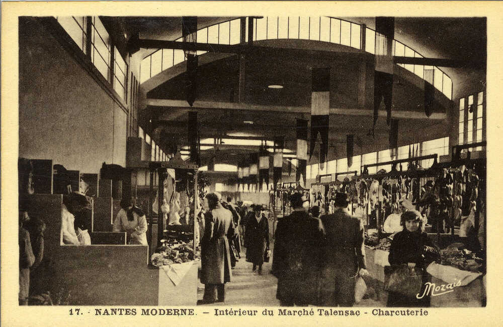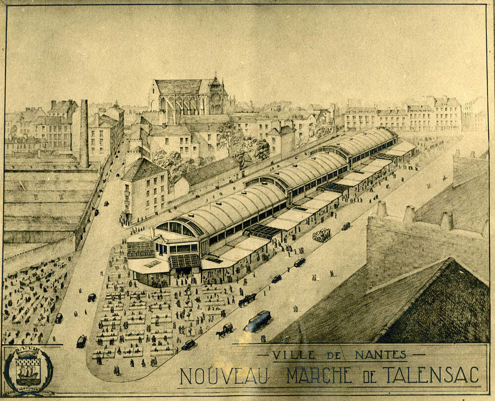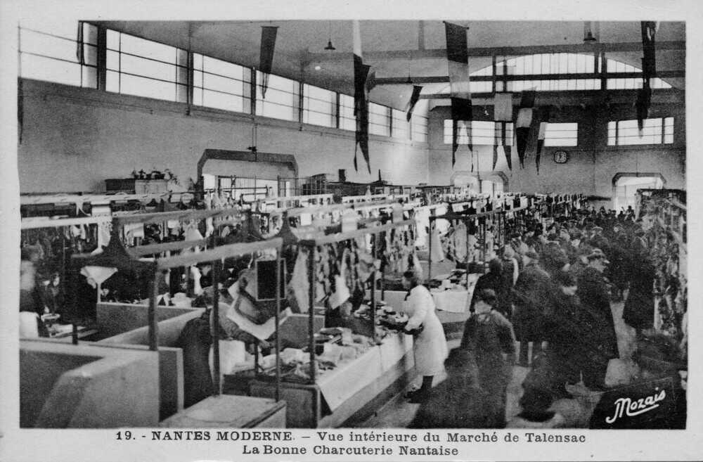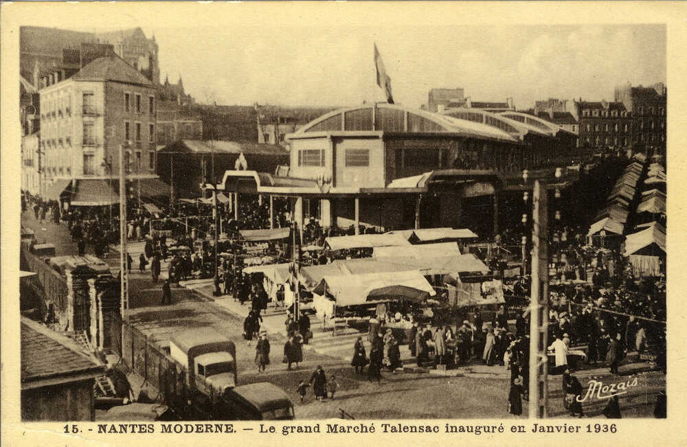Le 8 janvier 1937, Auguste Pageot, maire de Nantes de 1935 à 1940, inaugure le marché couvert de Talensac, situé sur un terrain acheté par la ville en 1825 et initialement occupé par les abattoirs de 1829 à 1933. La réalisation de ce marché est permise par le transfert des abattoirs à Pirmil pour des raisons d'hygiène et de nuisances liées à cette activité en centre-ville. Les marchés extérieurs existant alors à proximité sont supprimés (Feltre, Saint Similien et Talensac -le long des abattoirs-) et les commerçants sont invités à rejoindre le nouveau bâtiment et ses abords.