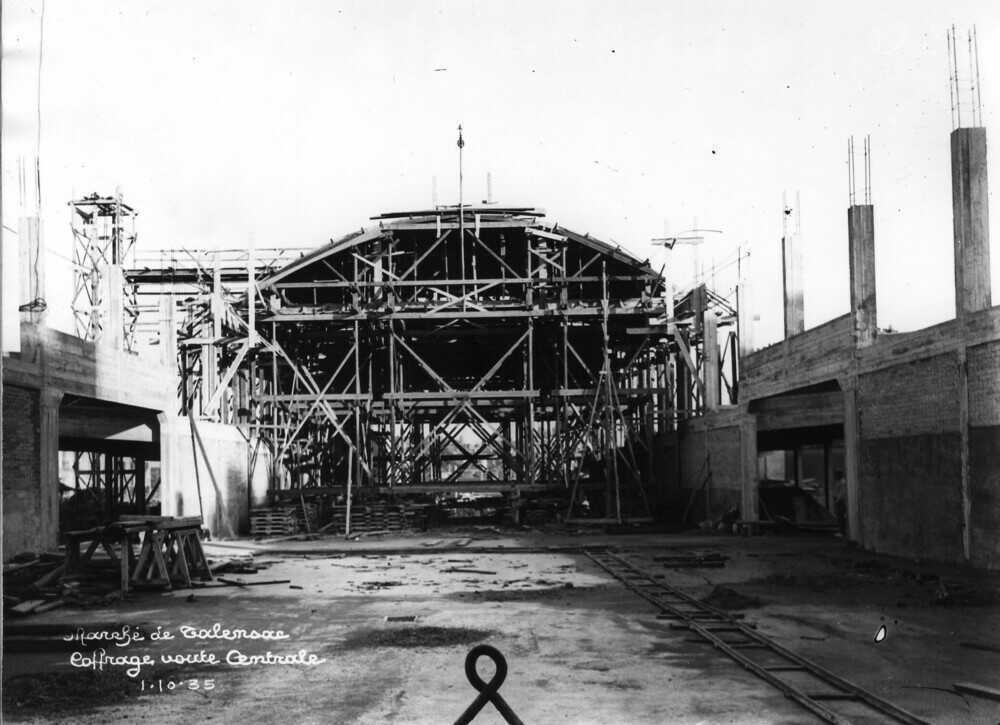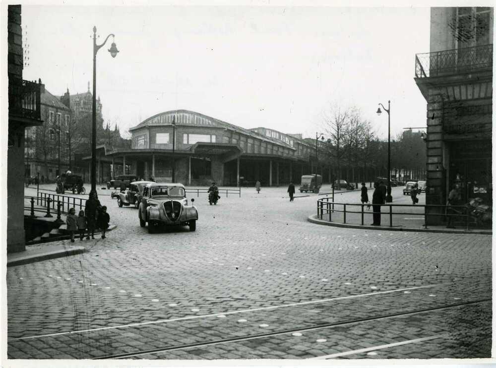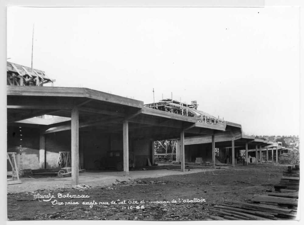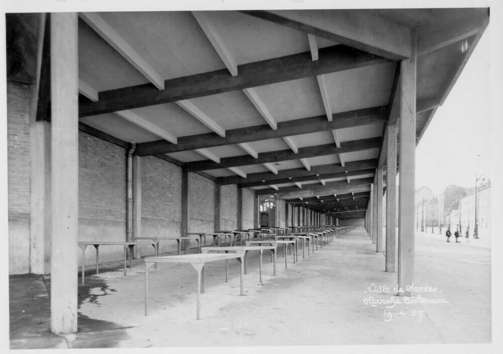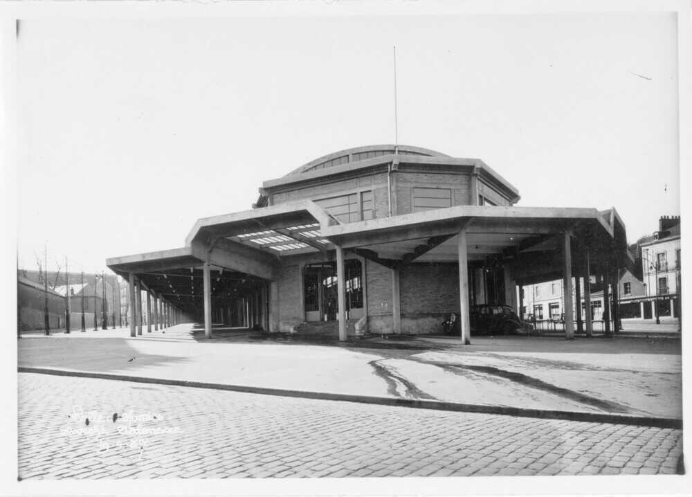 Le bâtiment et l’aménagement du marché sont définis par Léopold Cassegrain, maire de 1929 à 1935 : « L'emplacement laissé libre par les abattoirs sera aménagé en vaste esplanade comprenant, à l'extrémité Ouest, du côté de la rue Bel Air, une partie couverte et fermée garnie de tables et affectée à la boucherie et à la charcuterie et, sur le reste de la surface, un large terre plein pour moitié couvert et pour moitié en plein air où s'installeront les marchands de légumes et de poissons et les petits producteurs. »