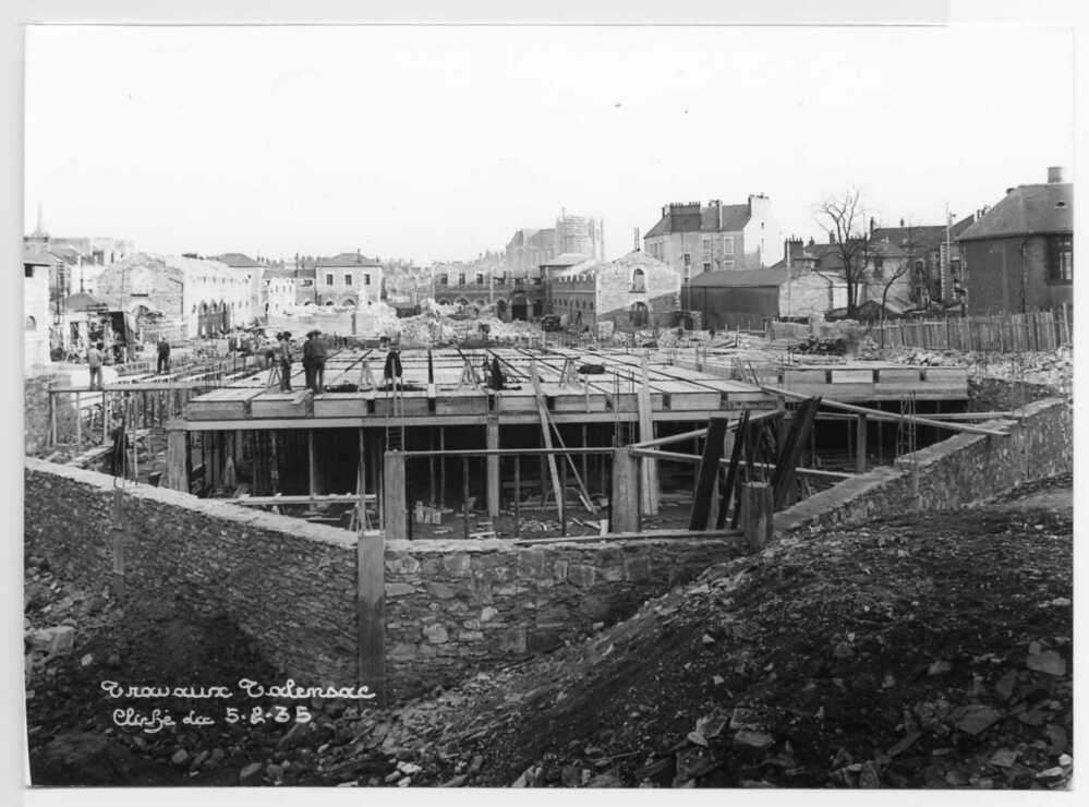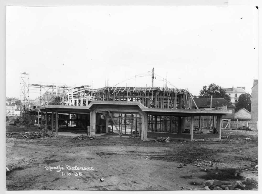 Commencés en juin 1934, les travaux de construction -retardés par les grèves nationales de 1936- sont accompagnés d'importants travaux de voirie sur les rues Talensac et Basse-Porte. Des platanes sont également plantés pour border la place élargie et les becs à gaz sont remplacés par de hauts lampadaires électriques.