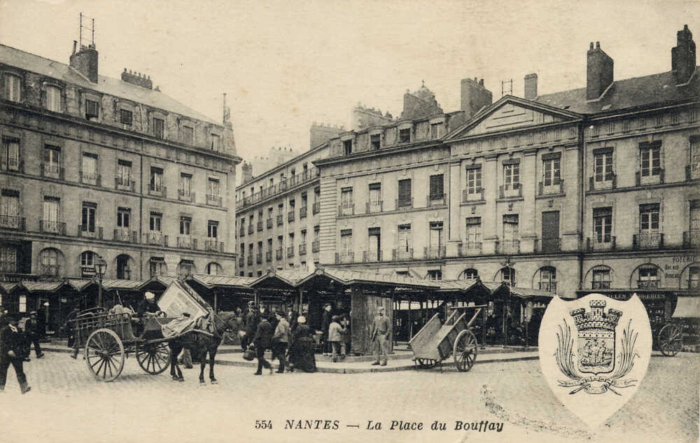 En 1336, une ordonnance de police du duc Jean III et de l’évêque Daniel prescrit aux marchands d’agneaux, volailles et « autres denrées […] mortes ou vives » de n’exercer leur commerce qu’« au lieu acoustumé » (place du Change) et aux pêcheurs de ne mettre en vente leurs prises qu’à la poissonnerie. Au 15e siècle, poissons secs et « trempés », de mer et de rivière, sont vendus place du Bouffay. Au début du 16e siècle, l’existence d’une poissonnerie est attestée sur la grève de la Sauzaie, où elle était vraisemblablement implantée bien avant. Autorisée en 1582, réalisée en 1628, incendiée en 1718, la halle du Bouffay est reconstruite près de l’Hôtel des monnaies et abrite alors artisans, marchands de pain,de volailles, de légumes et de fruits… Au 18e siècle, Nantes dispose aussi, près de l’Erdre, de la halle de la boucherie et de la cohue au blé édifiée à la fin du 15e siècle, détruite en 1767 et reconstruite entre 1786 et 1789 quai Brancas.