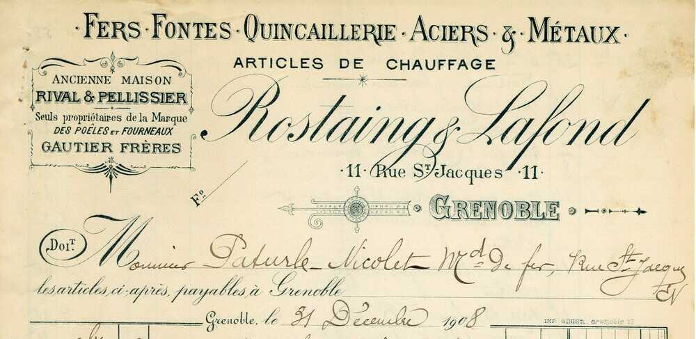 Sur l’une, on reconnaît la statue de la Vierge à l’Enfant portant une couronne à triple étage, sur l’autre la façade de la nouvelle église avant la construction du clocher en 1893-1895. Sur l’autre face apparaît un nom, ROSTAING, c’est celui du fournisseur du bloc d’acier qui allait recevoir la gravure. Il s’agit probablement de l’entreprise grenobloise Rostaing et Lafont, « Fers – Fontes – Quincaillerie – Aciers – & Métaux ».