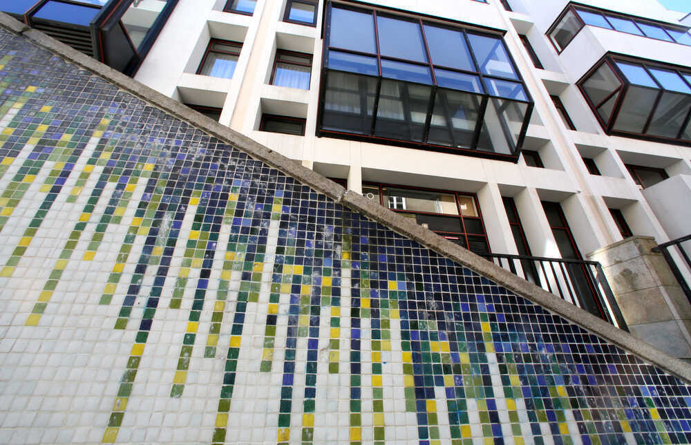 - La mosaïque décorant les murs jouxtant la rue Neuve-des-Capucins de Françoise Laborie et Elisabeth Soulie.