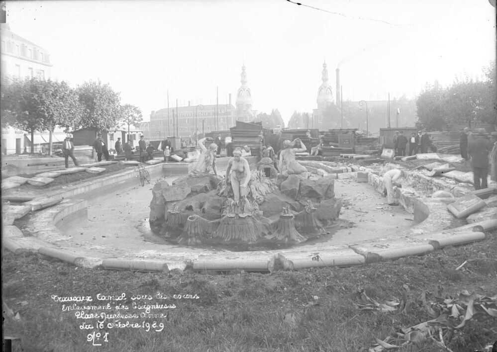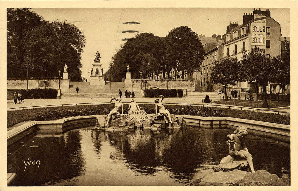 Dans le cadre du projet d’embellissement de la place en square au début du 20e siècle, il est décidé d’y installer des parterres et une fontaine monumentale représentant des naïades et un « enfant aux crabes ». L’œuvre signée du sculpteur Fernand David est érigée en 1913. Ce monument est déplacé lors des travaux de détournement de l’Erdre sous les cours par le tunnel Saint-Félix en 1930.