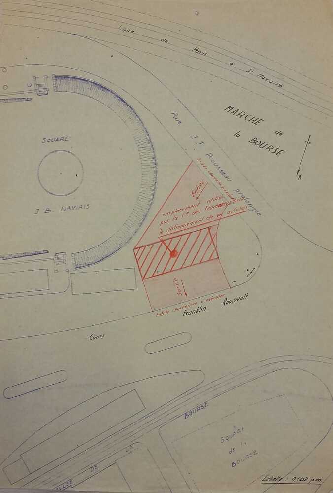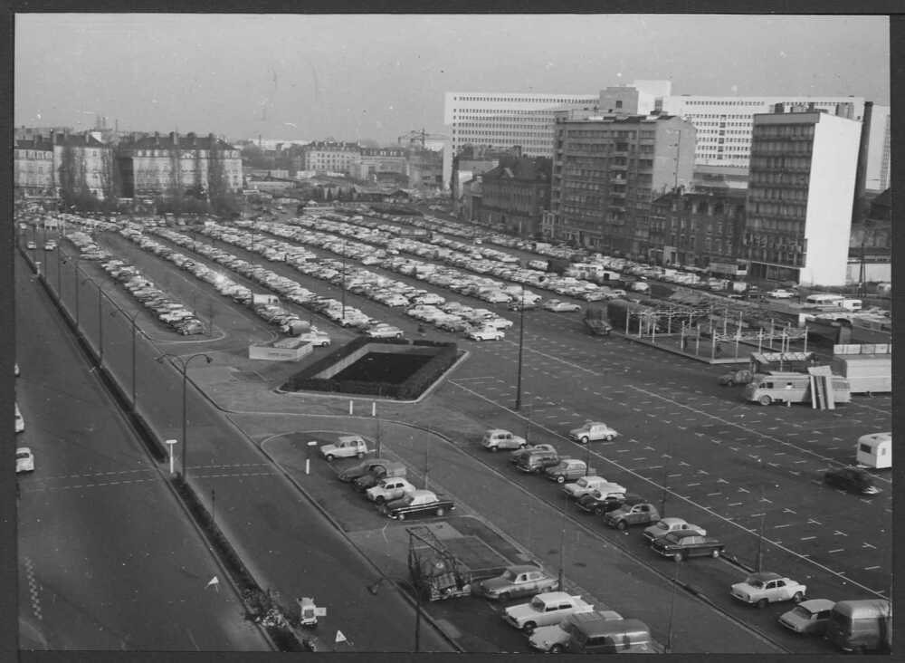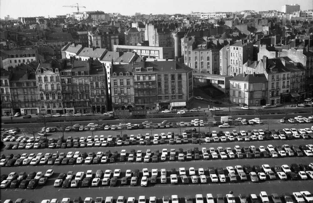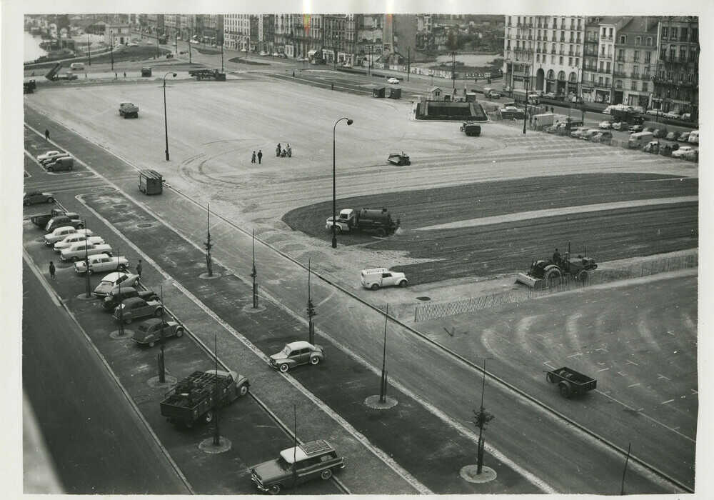Sur l’espace central, l’aménagement du parking résulte d’un non-projet. En effet, la fonction des terrains gagnés sur la Loire n’a jamais été réellement définie par les services de la Ville ni tranchée par les élus. Seuls les passages de diverses lignes de transport apparaissent dans les plans des années 1925-1935. C’est ainsi qu’à partir des années 1950, la voiture conquiert peu à peu cet espace vacant qui devient un « parking sauvage ». En 1962, les travaux d’aménagement du parking entérinent cette appropriation de l’espace par la voiture.