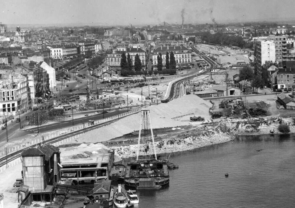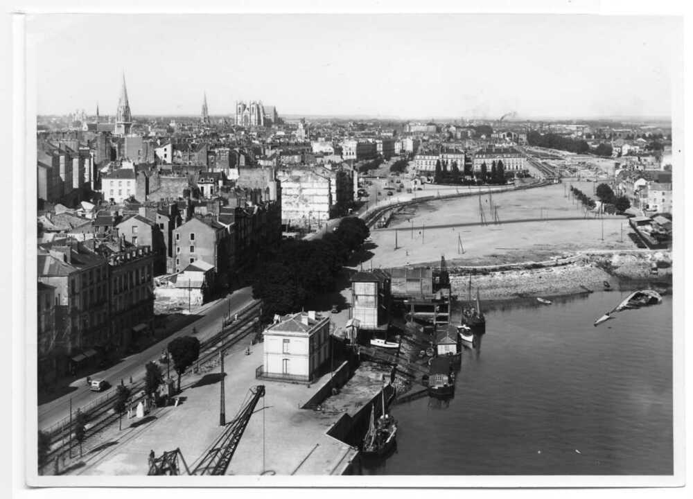 Entre 1945 et 1970, la Reconstruction érige de nouveaux logements et édifices publics autour de la place. Signe de l’éloignement du fleuve et du déplacement de la rive, en 1951, la piscine Léo-Lagrange, construite à la pointe de l’ancienne île Gloriette, devient la nouvelle proue sur le fleuve dans un espace dont les fronts urbains ne dialoguent plus ensemble.