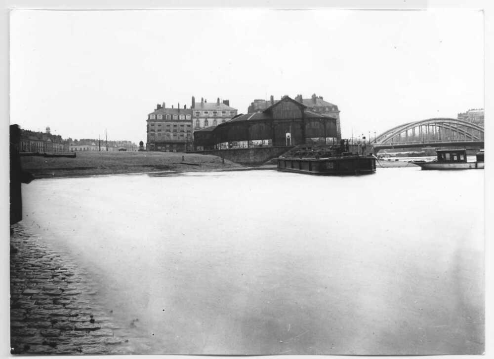 Les bains sont remplacés en 1867 par un marché couvert qui prend le nom de « marché de la Hollande ». Ce nouveau bâtiment de fer et de verre, plus conforme aux standards de la révolution industrielle et, sans doute, plus en accord avec l’environnement du port, change la perception de l’entrée de ville. La construction de ces halles qui deviendront, jusqu’à la construction du marché du Champ-de-Mars, le marché principal du centre-ville, acte l’importance géographique de l’île Feydeau au cœur d’un espace urbain renouvelé par la conquête des terres fluviales. En contrebas, sur les grèves aménagées, les pêcheurs débarquent quotidiennement le poisson frais.