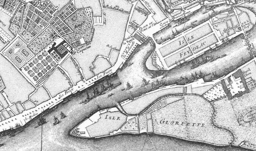 Symptomatique de la conquête urbaine des îles, cette place fluviale a, jusqu’en 1820, une toponymie géographique : pointe ou proue ouest de l’île Feydeau. Jusqu’aux années 1820, la « petite Hollande » semble être restée sur la rive avant que le toponyme ne se déplace.