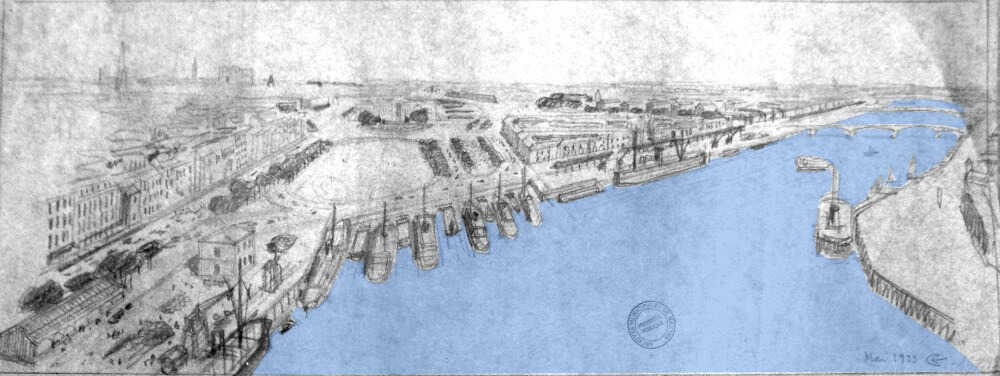 Étienne Coutan, architecte de la Ville, propose plusieurs projets d’aménagement de la nouvelle aire urbaine créée par les comblements. En 1933, l’un de ces projets propose de refonder le port de Nantes et de créer une nouvelle esplanade de la Petite-Hollande, une porte sur la Loire : un baume pour les Nantais traumatisés par les comblements lancés depuis treize années.