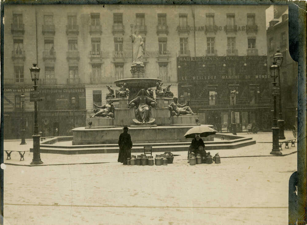 Une fois la place terminée, encore faut-il décider du monument qui l’ornera. Le projet d’une fontaine publique sur la place Royale est ancien : dès 1791, Mathurin Crucy propose une imposante structure avec une statue inspirée de l’art antique. La Ville n’est malheureusement pas dotée d’un service d’eau permettant d’amener celle-ci jusqu’à la place. L’idée d’une fontaine est donc abandonnée jusqu’en 1852, alors que le sculpteur et artiste nantais Daniel Ducommun du Locle s’associe à l’architecte Driollet afin de concevoir un nouveau projet. Ensemble, ils réalisent une fontaine magistrale, faite de granit et de marbre, tandis que les sculptures de bronze sont coulées par le célèbre fondeur Voruz. La fontaine est inaugurée le 16 mars 1865 en présence du maire de Nantes, Ferdinand Favre. Par les matériaux utilisés, les symboliques mobilisées et les technologies dont elle est dotée, la fontaine inscrit Nantes dans une nouvelle modernité et marque la conquête de la Ville sur l’eau courante.