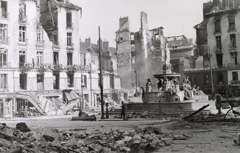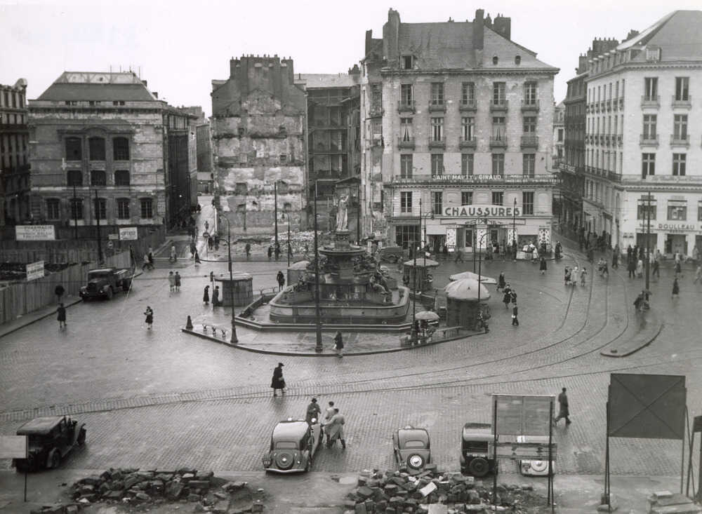 En septembre 1943, la place Royale est touchée par les bombardements alliés, à l’instar d’une grande partie du centre historique. Tandis que plus de la moitié des immeubles de la place est rasée, les journées des 16 et 23 septembre font des milliers de victimes, marquant les esprits des Nantais durant plusieurs décennies. Le 16 septembre, de nombreux Nantais et Nantaises flânent dans les magasins en vue de la rentrée scolaire qui se prépare. Habitués à entendre chaque jour les alertes à la bombe, les habitants tardent à se mettre à l’abri quand les premiers obus s’écrasent sur le centre-ville et notamment sur la place Royale. Le 23 septembre, deux nouvelles attaques, à 8h55 et 18h45, détruisent une partie du port. Le bilan des deux journées est terrible : 1463 morts, 2500 blessés, 10 000 familles sans logis et 513 hectares de ville ravagés. La place Royale est à moitié détruite... Jusqu’au 2 août 1944, la ville subit encore seize attaques aériennes responsables de 206 décès supplémentaires. Nantes est à reconstruire, 2000 immeubles sont détruits et 6000 autres sont désormais inhabitables.