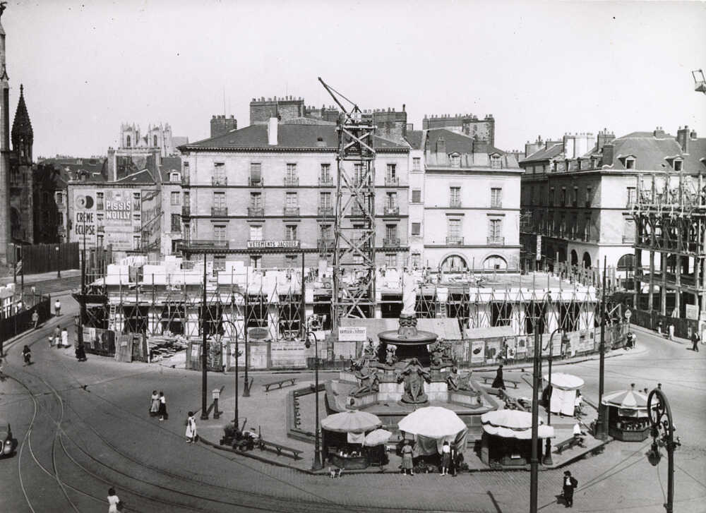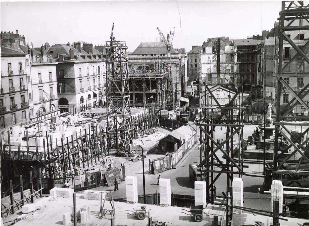 Le 4 novembre 1943, la ville de Nantes est déclarée sinistrée. Il faut reloger ces milliers de Nantais qui, en plus d’être endeuillés, ont perdu foyer et commerce, et envisager la reconstruction. Très rapidement, des choix sont faits : la place Royale est rebâtie quasiment à l’identique. En décembre 1944, le Ministère de la Reconstruction et de l’Urbanisme est créé. À Nantes, c’est l’architecte Michel Roux-Spitz qui est chargé d’établir le plan de Reconstruction. Les rues sont élargies pour devenir de larges artères, adaptées notamment à l’utilisation croissante de la voiture, à l’exemple de la rue du Calvaire. Place Royale, on reconstruit à l’identique en suivant l’esthétique du 18e siècle. Pour améliorer la circulation aux alentours de la place, les rues de l’Arche-Sèche et La Pérouse sont élargies. La partie est de la place Royale est entièrement rebâtie. Les cours intérieures sont supprimées et les accès aux appartements sont transférés rue du Couëdic, laissant la façade du rez-de-chaussée entièrement libérée pour son utilisation commerciale.