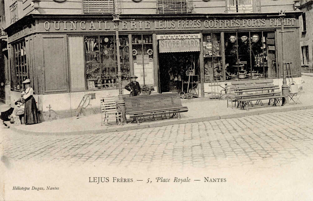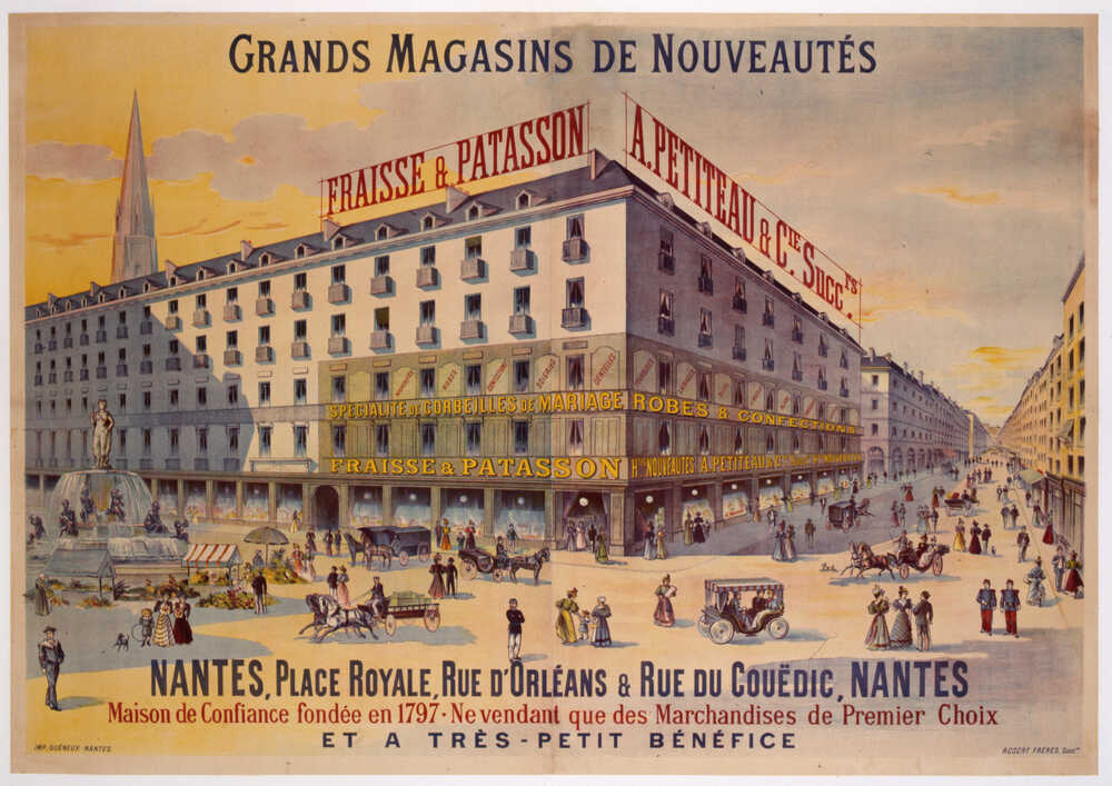 Le n°1 de la place Royale accueille pendant plus de 50 ans le magasin Fraisse et Patasson. Ses propriétaires sont d’anciens négociants, ayant fait fortune au début du 19e siècle. Spécialisé dans les confections vestimentaires pour dames, il marque durablement le commerce nantais. Il est remplacé au tout début du 20e siècle par le magasin Au Grand Bon Marché. Ce commerce, qui se fait appeler le meilleur marché du monde (rien que cela !), se spécialise dans les vêtements masculins. C’est un grand magasin typique du début du 20e siècle, comme Au Petit Paris. Tous deux habillent la place Royale de leurs vitrines et de leurs enseignes démesurées.