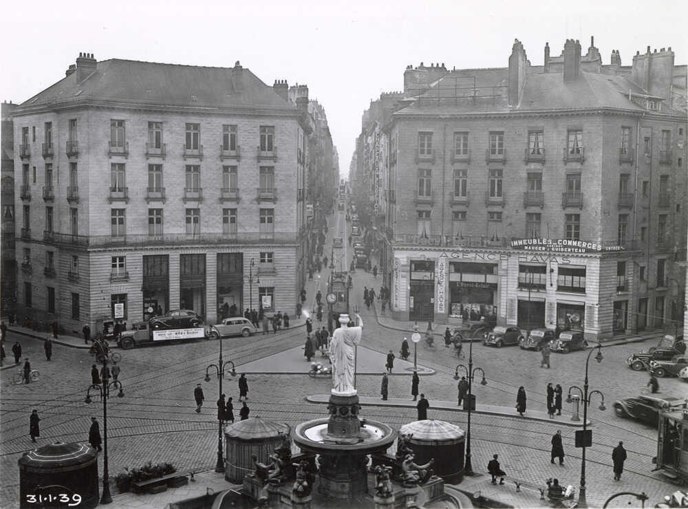Après la guerre, les commerces ont peu à peu disparu de la place, laissant davantage d’espace aux voitures, toujours plus nombreuses. La fontaine sur les bords de laquelle des foules de gens s’asseyaient encore au 19e siècle, est réduite à l’état de rond-point, malgré un tapis végétal qui réjouit les riverains. Les dégâts causés par la Seconde Guerre mondiale ont fragilisé la structure de la fontaine. Le coût de la réparation étant dix fois supérieur à celui de la démolition, sa destruction est envisagée. Finalement, la Commission régionale des dommages de guerre acceptant le financement du bassin de granit, la restauration est actée en 1961 accompagnée d’un nouvel aménagement. Le responsable des espaces verts de la Ville, Monsieur Plantiveau, dessine un parterre de gazon et de buis fleuris. Les travaux, engagés au printemps 1962, sont terminés à l’été, au plus grand bonheur des Nantais. Pour le journal La Résistance, ces « motifs végétaux soigneusement agencés » profitent surtout aux habitants des immeubles ceinturant la fontaine. Ouest France, plus critique, regrette qu’il soit désormais impossible d’accéder à la fontaine.