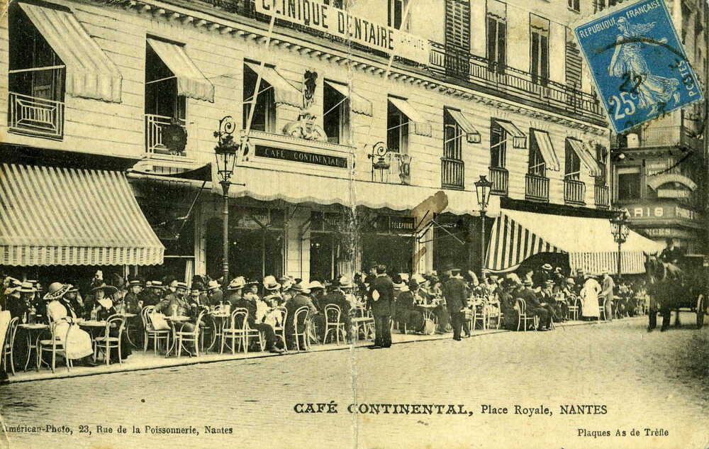 À partir de la seconde moitié du 19e siècle, la place Royale accueille deux cafés d’importance : le café d’Orléans (n°11) et le café Le Continental (n°1). Le café d’Orléans est inauguré le 24 septembre 1862. Six ans plus tard, une salle de billard est mise à disposition et l’entresol accueille à la fin du 19e siècle toutes sortes de sociétés plus ou moins académiques, comme le cercle du Lézard en 1889, qui se réunit autour de questions de magnétisme et de spiritualité… À l’époque, les cafés sont au cœur de la vie nantaise : organisation de tombolas (les tickets et les lots sont conservés au café d’Orléans), de réunions politiques, etc... Malheureusement, le café d’Orléans fait partie des victimes des bombardements de 1943 et contrairement à son voisin Le Continental, il ne s’en relèvera pas. Ce dernier se repère de loin grâce aux lettres géantes qu’il arbore sur sa toiture. Inauguré le 15 avril 1885, on peut y consommer des sodas ou bien des glaces, et profiter des nombreux concerts donnés par le propriétaire Charles Viriot. Le café est détruit en 1943 puis reconstruit après-guerre. Il est alors autorisé à bâtir une véranda sur le trottoir.
