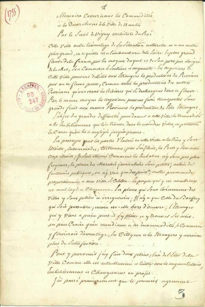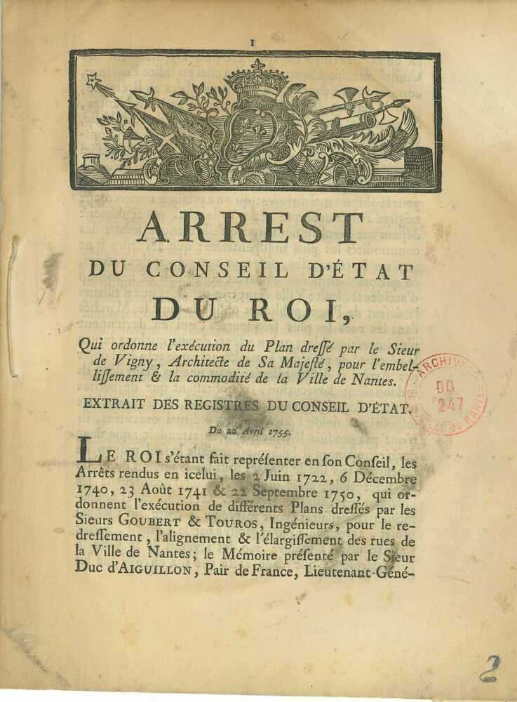 Le duc d’Aiguillon, commandant en chef de Bretagne, commande à l’architecte parisien Pierre de Vigny (1690-1772), qui bénéficie alors d’une grande notoriété, un plan général de développement de la ville de Nantes.