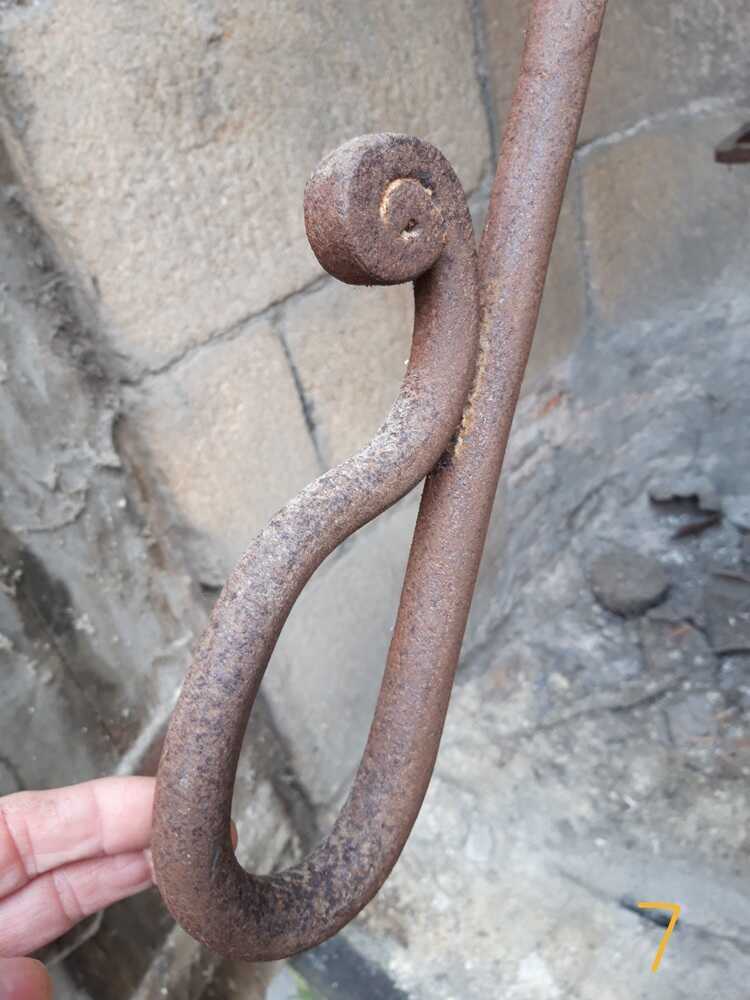 Le bras de cette pompe en fer relativement long présente une poignée forgée. La niche étant très étroite, l’élévation de ce bras se réalise vers l’ouverture de la niche ; un grand étrier fixé dans la maçonnerie protège la pompe lors de son abaissement. La charnière de ce bras est également ouvragée. La présence de cette pompe est très certainement à l’origine de le dénomination « immeuble de la pompe » retrouvée dans les archives.