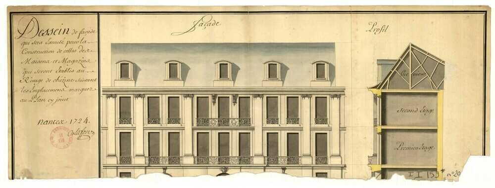 Au début du 18e siècle, Gérard Mellier, maire de Nantes, tente de trouver des solutions pour financer un quai favorable au commerce transatlantique en plein développement. En 1712, il décrète un premier alignement du front urbain depuis la place de la Petite hollande – actuelle place de la Bourse – jusqu’à la rue des Capucins : les propriétaires ayant une maison sur la rive se voient rétrocéder des terrains dans le prolongement de leur parcelle. Ils sont alors autorisés à augmenter la surface intérieure de leurs maisons et à mettre leurs rez-de-chaussée à l’abri de l’eau en exhaussant leurs sols. En échange de cette cession, les propriétaires s’engagent à exhausser leurs parcelles au moyen d’un quai et à reconstruire leurs façades selon les prescriptions de la Ville : « Touttes de niveaux et dans un mesme ordre d’architecture extérieure et seront en pierre de taille ou de tuffeau battie, les portes d’entrée seront égalles aussy bien que les croisées et cordons de chaque estage, et cependant seront posées des bornes dans ledit alignement à vis de chacune des maisons. »