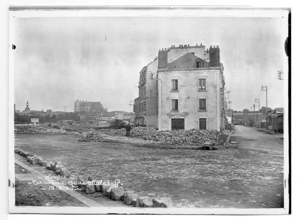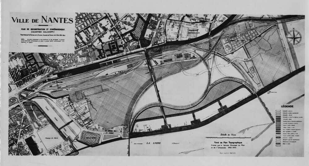 En 1946, 18 000 m3 de remblais rehaussent d’un 1,5 mètres le terre-plein et la rue du quai Malakoff tandis que 45 000m3 de remblais issus des destructions permettent d’agrandir la rive septentrionale de 15 à 20 mètres gagnés sur la Loire. Des parcs à grume et des dépôts de sable sont installés sur le quai pour stocker les futurs matériaux de construction.