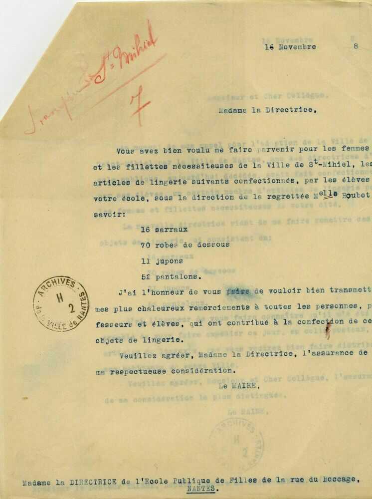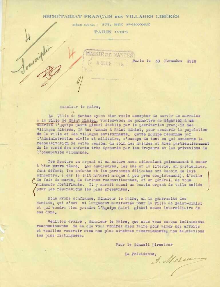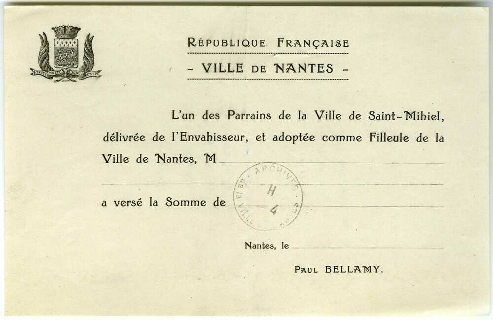 La ville lorraine de Saint-Mihiel a été occupée par les Allemands pendant la Première Guerre mondiale et a été très touchée par les bombardements. Ville martyre, elle est libérée par les troupes américaines lors de la bataille de Saint-Mihiel les 12 et 13 septembre 1918. Nantes, en choisissant Saint-Mihiel comme filleule, l'aide à se reconstruire en envoyant des convois de denrées et de matériel, ainsi que des fonds financiers.